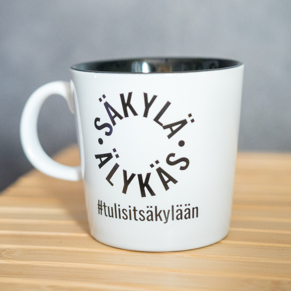 Valkoinen muki mustalla sisuksella. Mukin kyljessä Säkylä Älykäs logo pyöreällä sekä #tulisitsäkylään
